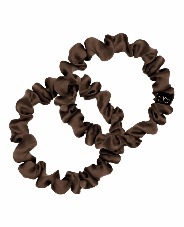 Sada dvou hedvábných gumiček SLIM v chocolate barvě. Jsou extrémně jemné – nevytrhávají vlasy a nezpůsobují záhyby.