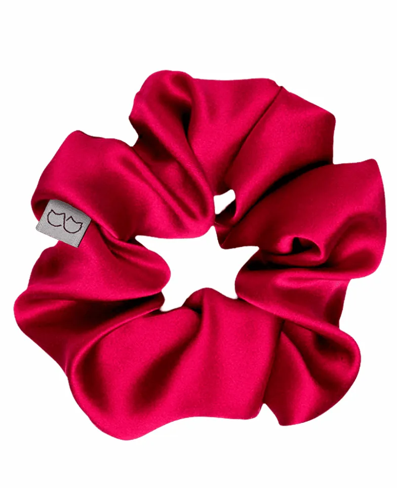 Silk scrunchie hair band in carmine color. Its exclusive character is emphasized by the beautiful and noble luster of silk.