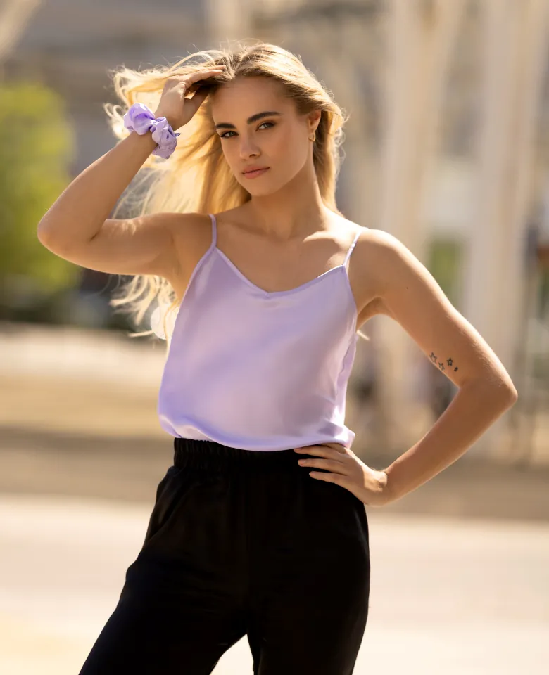Ponadczasowy, lekki satynowy top z naturalnego jedwabiu, może być noszony zarówno jako odzież wierzchnia jak i bielizna. Adjustable straps improve wearing comfort. The model is 170 cm tall and wears size S. Made in Poland with the highest quality.