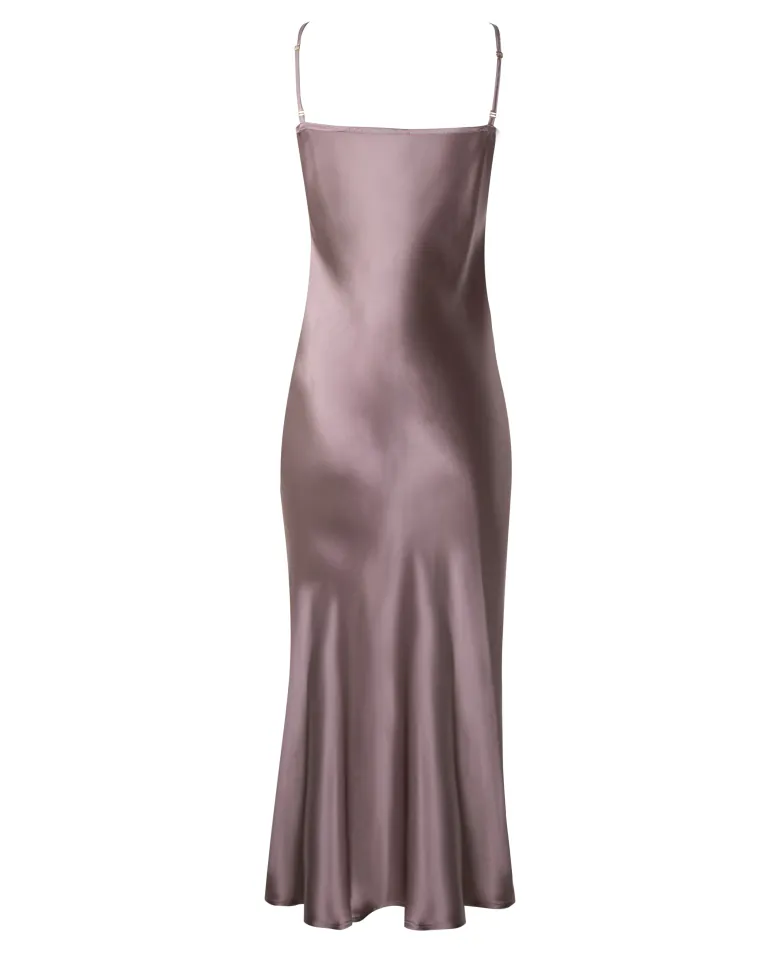 Ponadczasowa, lekka satynowa sukienka z naturalnego jedwabiu z eleganckim dekoltem typu woda. Skrojona ze skosu, dzięki czemu idealnie układa się na sylwetce. Na biuście zastosowano podwójną warstwę materiału. Komfort noszenia poprawiają regulowane ramiączka. Modelka ma 170 cm wzrostu i nosi rozmiar S.