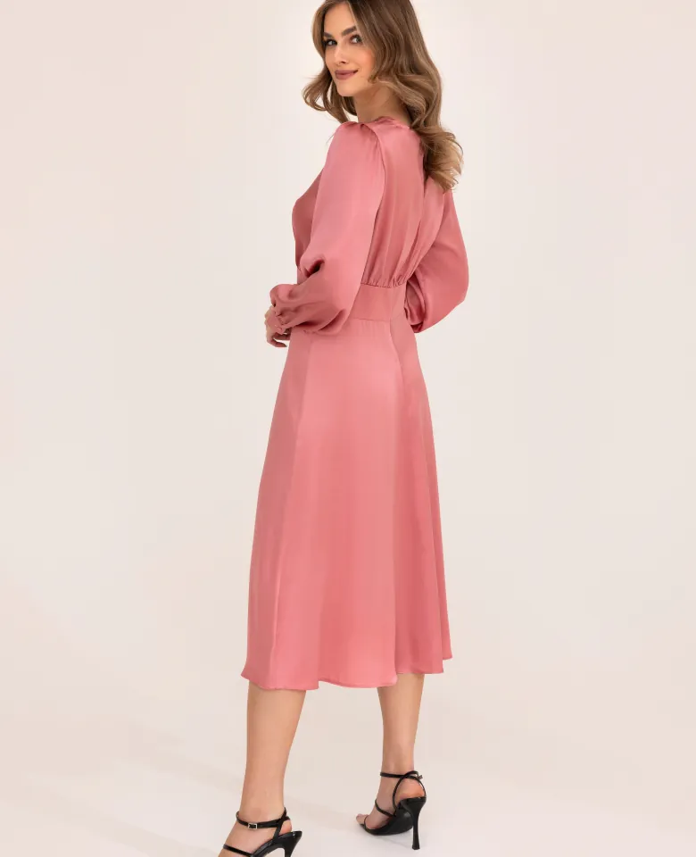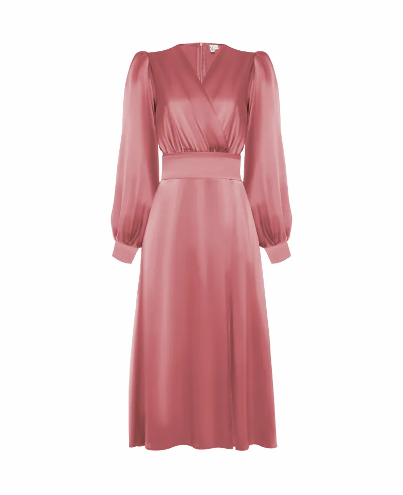 Jedwabna sukienka midi z rozcięciem na nodze. Posiada długie, bufiaste rękawy z wszytymi delikatnymi poduszkami, które nadają lekkości. Z tyłu zapinana na ukryty zamek błyskawiczny. Uszyta z 100% jedwabiu. Można ją wystylizować na wiele sposobów, zarówno na specjalne okazji jak i na co dzień.