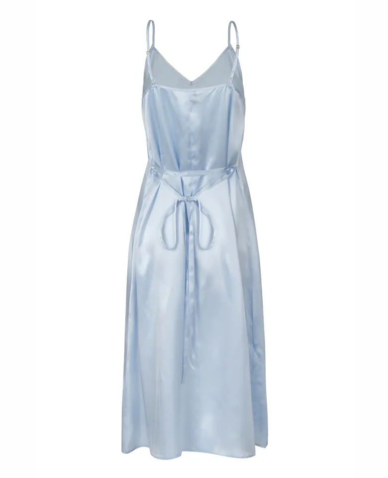 Ponadczasowa, lekka satynowa sukienka z naturalnego jedwabiu z dekoltem w kształcie litery V. Posiada luźny krój i pasek, który można zawiązać z tyłu lub z przodu, dopasowując ją do swojej sylwetki. Komfort noszenia poprawiają regulowane ramiączka. Modelka ma 175 cm wzrostu i nosi rozmiar S.