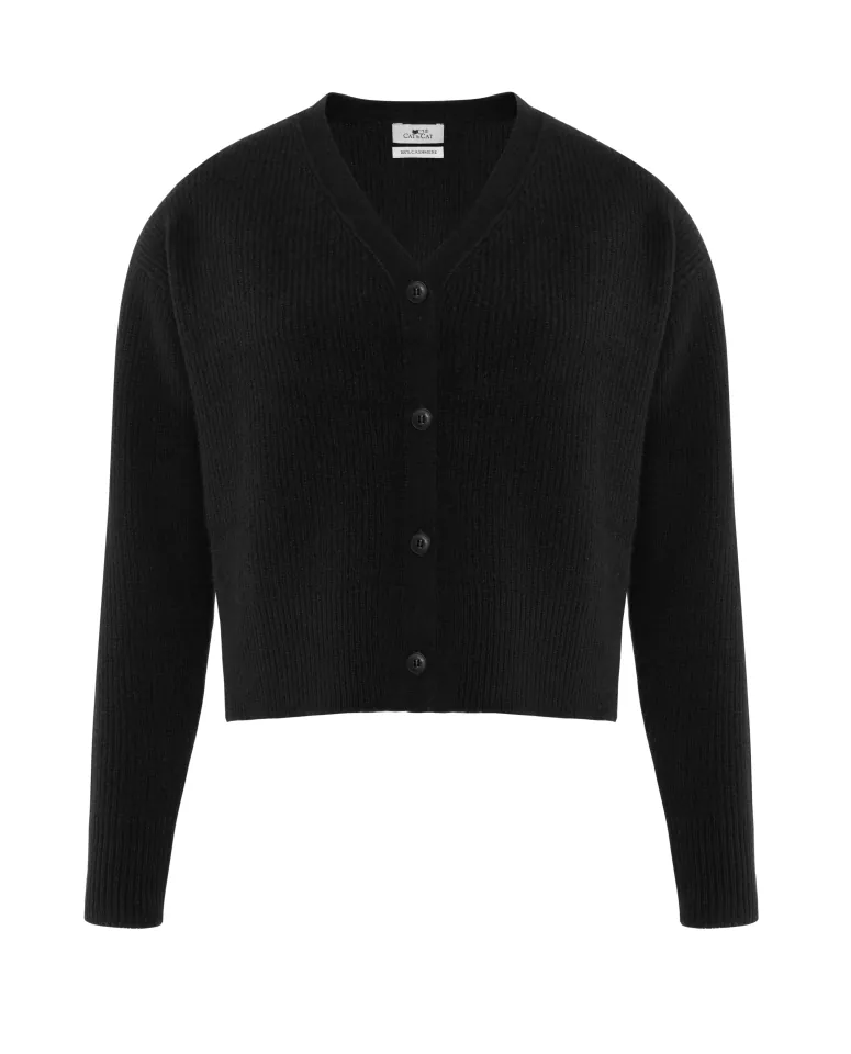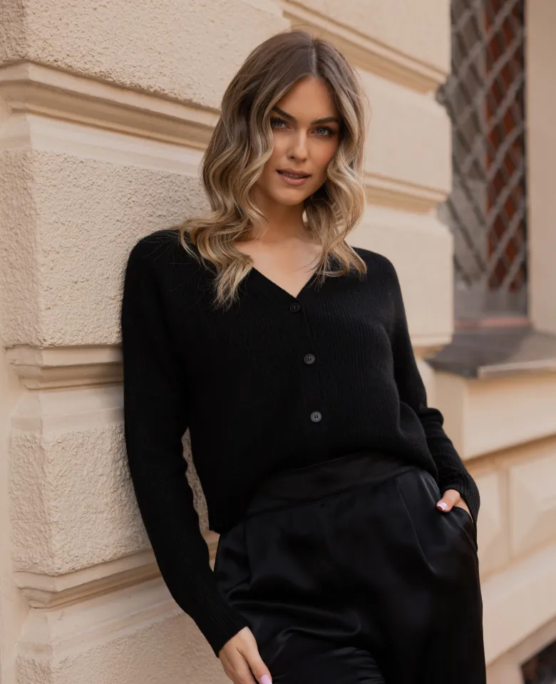 Kardigan z dekoltem w kształcie litery V, wykonany ze 100% czystego kaszmiru najwyższej jakości. Sweter ma obniżoną linię ramion, krótszy krój, średniej wielkości dekolt i zapięcie na guziki premium wykonane z żywicy i dobrane kolorystycznie do materiału. Jest wyjątkowo miękki, ciepły, a jednocześnie lekki. Dzięki swoim właściwościom termoregulacyjnym zapewnia najwyższy komfort noszenia. Kaszmir jest lżejszy niż wełna owcza, co sprawia, że ubrania z niego wykonane są bardziej przewiewne i wygodne, a jednocześnie nie tracą na ciepłocie. Kaszmir jest znacznie bardziej miękki i delikatny w dotyku niż większość rodzajów wełny. Dzięki temu swetry z kaszmiru są bardziej komfortowe w noszeniu, szczególnie dla osób o wrażliwej skórze. Kaszmir ma naturalny, elegancki połysk, który dodaje ubraniom wyrafinowania.